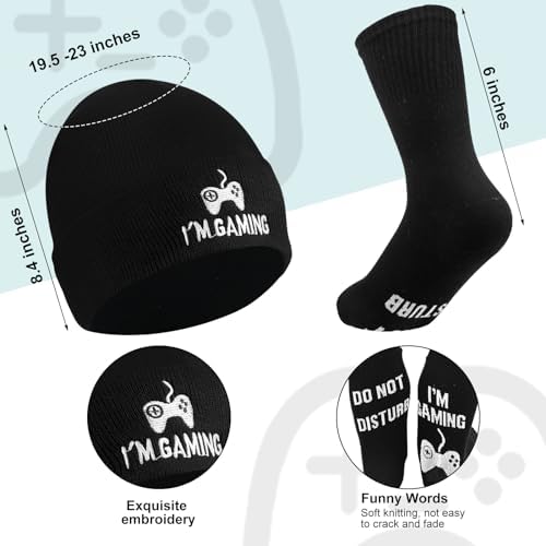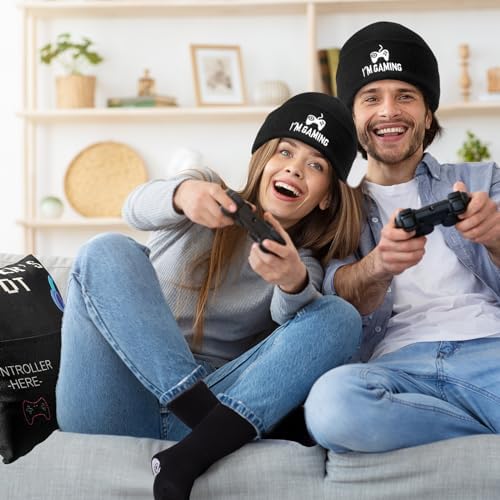 Detailed Sizes: the throw pillow covers are about 18 x 18 inches, making them ideal for decorating a gaming room or adding a touch of style to any space; Gamer socks are suitable for American shoe size 5.5-11, ensuring a comfortable and proper fit for most gamers; Beanie of gaming stuff is elastic, suitable for most people; Tumbler with lid is about 20 oz capacity, nice to contain different beverages